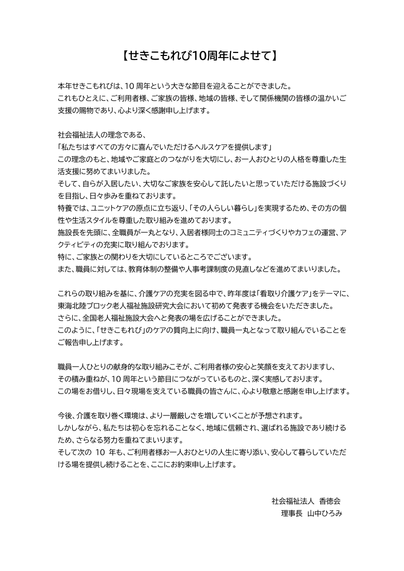 お知らせ せきこもれび10周年によせて 2026.04.09 社会福祉法人香徳会は、設立10周年を迎えました。 4月6日(月)には「せきこもれび10周年記念講演会」を開催させていただきました。 多くの方にご参加いただき、ありがとうございました。